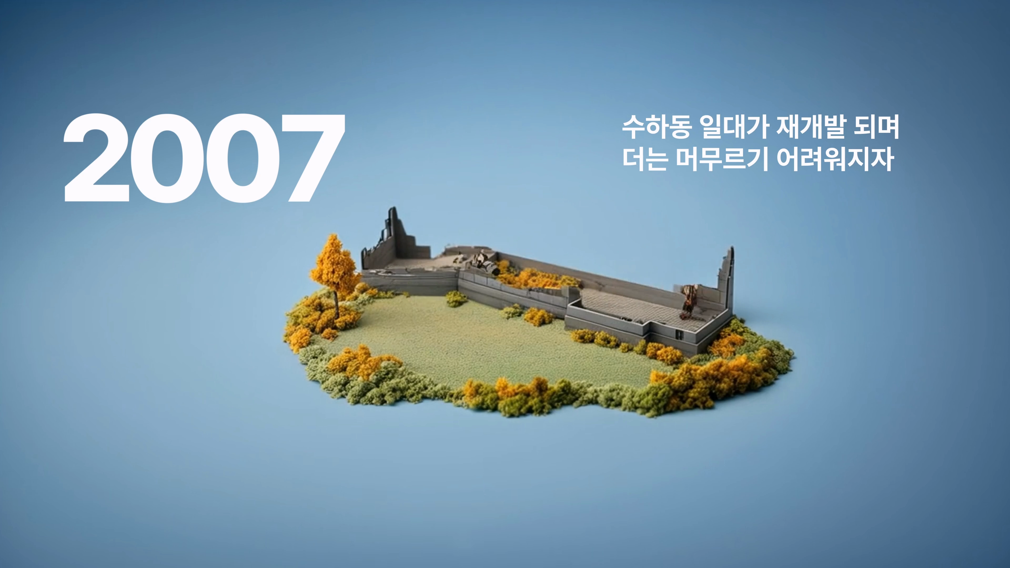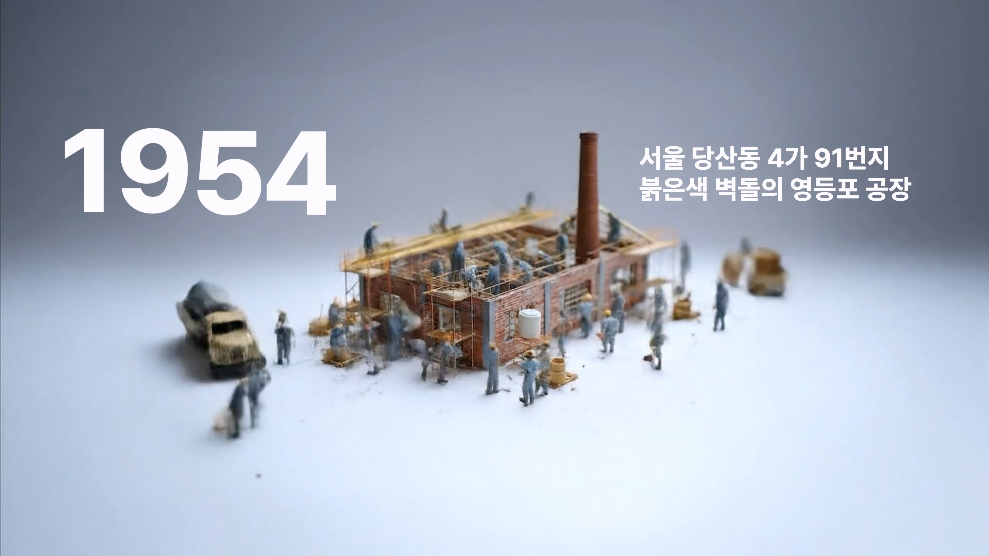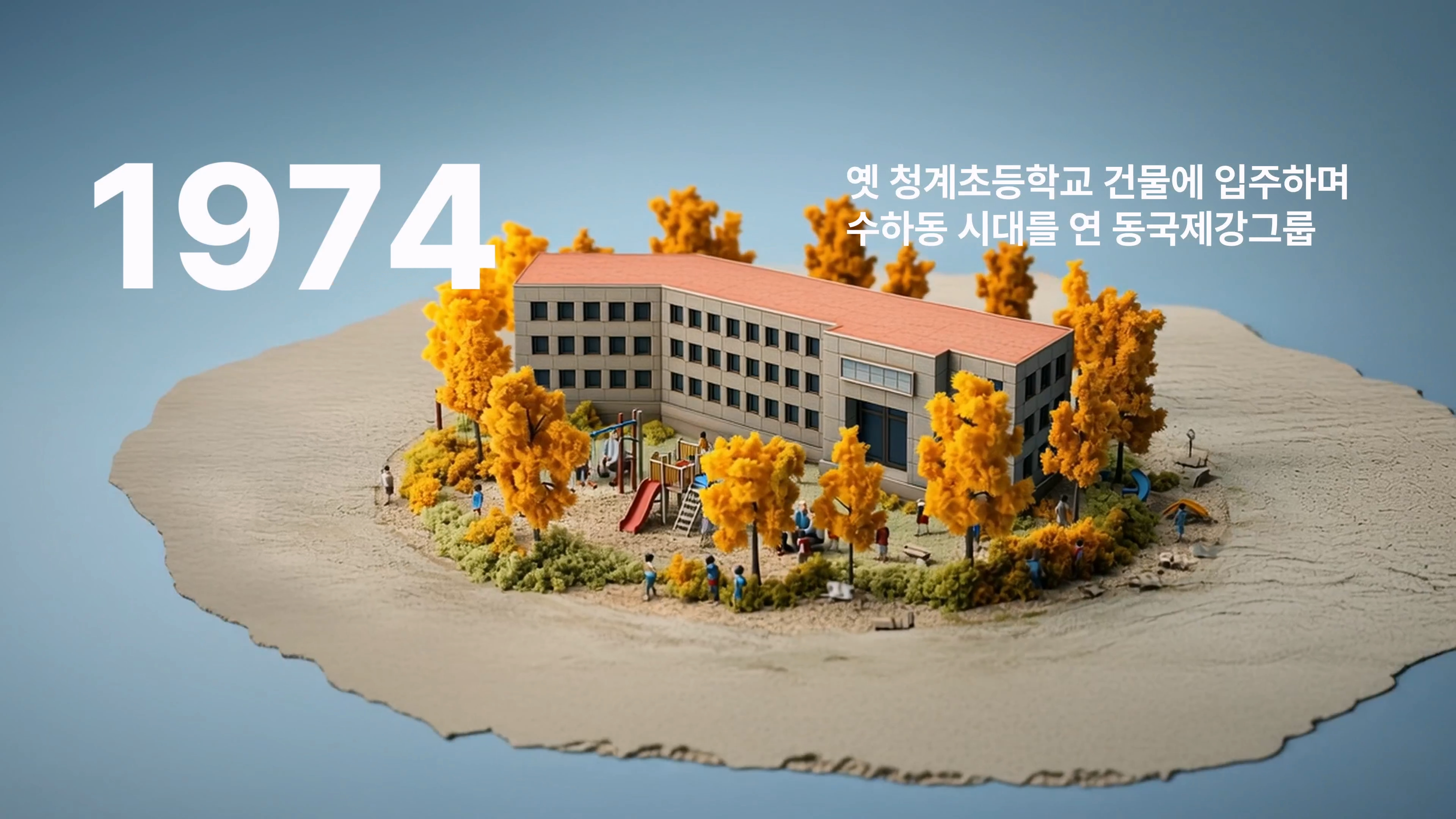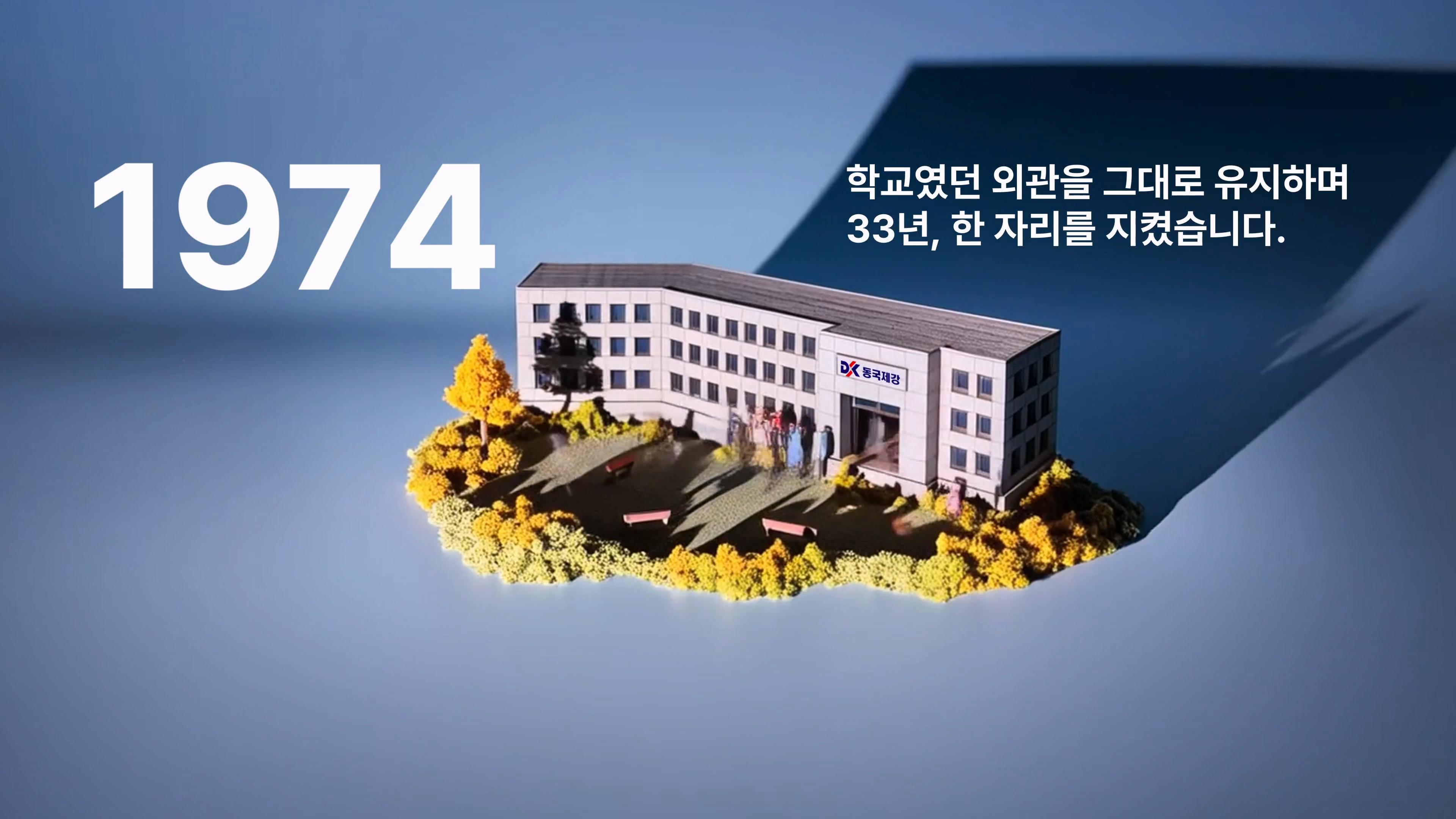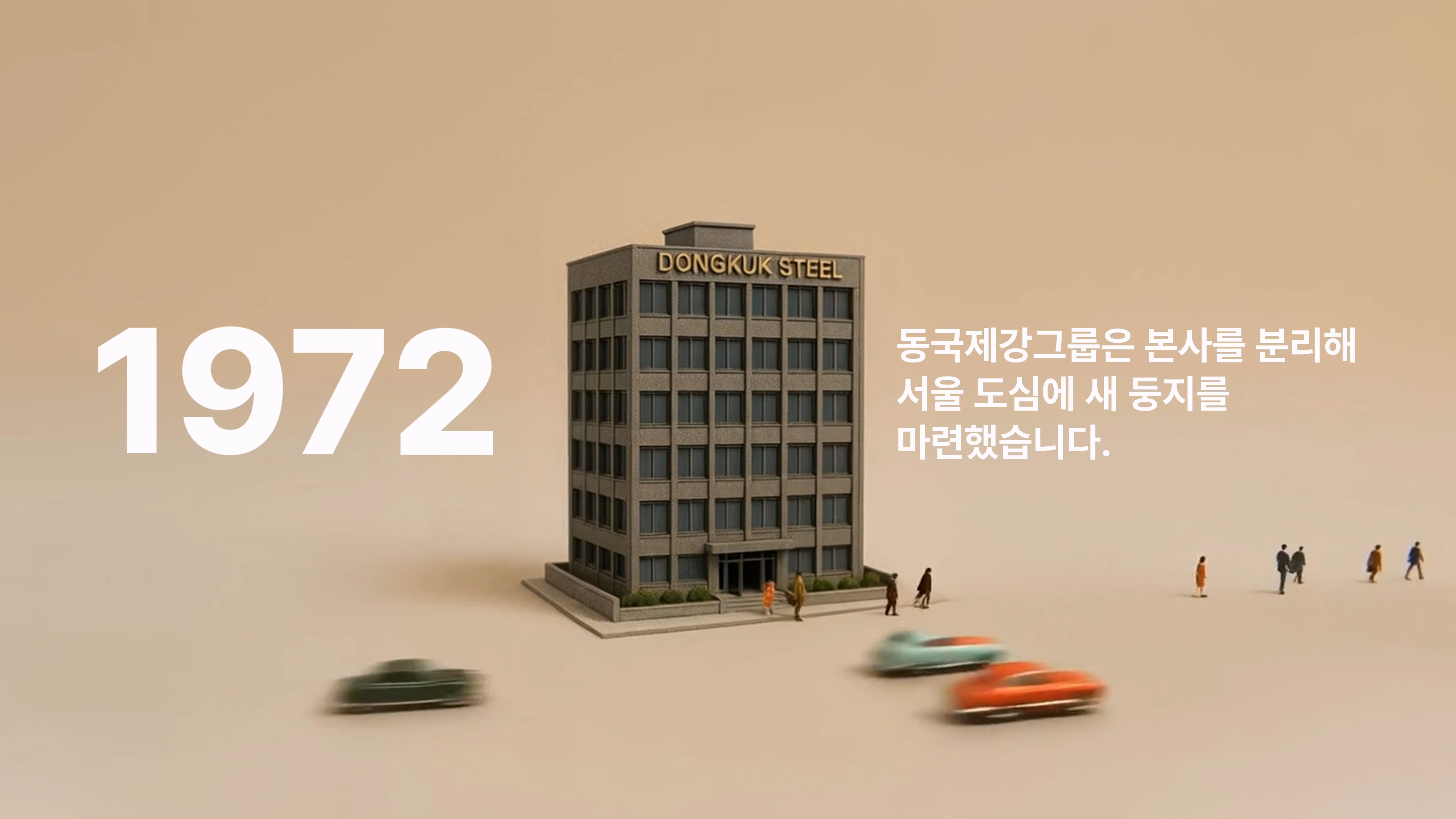 1954년 창립부터 2025년 현재까지 이어진 사옥의 변화를 한눈에 담고, 각 시대의 이야기를 짧은 문장과 심플한 영상으로 표현했습니다.